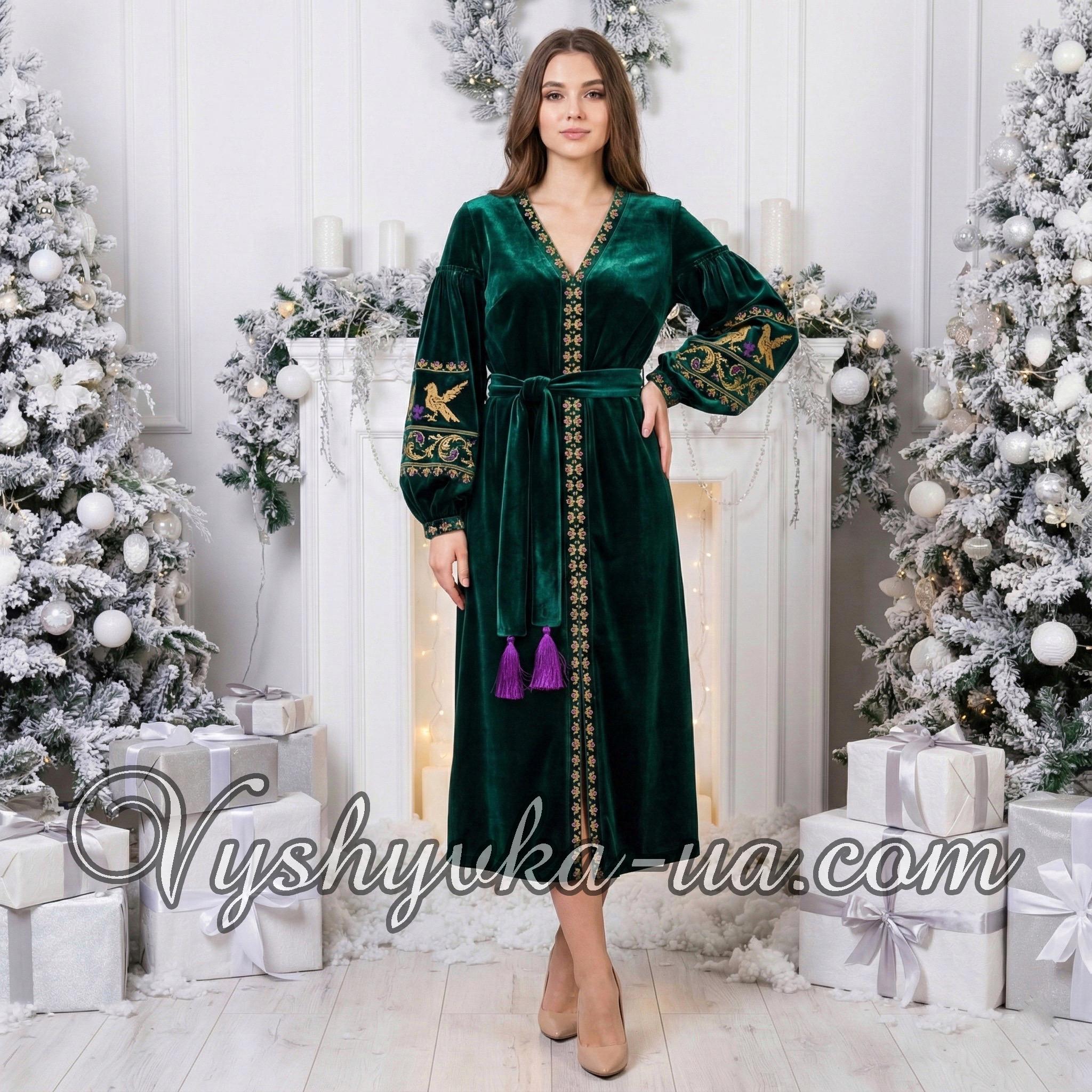 Розкішна міді-сукня з глибокого смарагдового оксамиту, прикрашена багатою золотисто-фіолетовою вишивкою з птахами та орнаментом на широких рукавах і по планці. Талію підкреслює пояс з великими фіолетовими кутасиками. Вишуканий та святковий образ з етнічними мотивами.